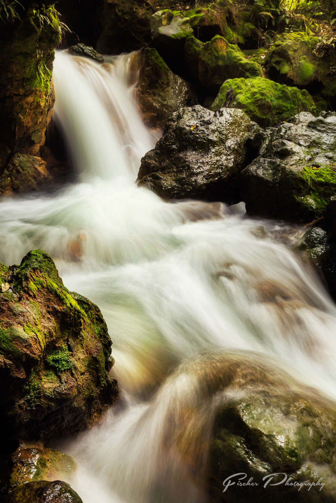 With the varying hues of color not only in the rocks and mosses, but also in the moderately fast moving water itself, I decided to go with what I consider a middle-range shutter speed for shooting waterfalls. On waterfalls that are made up of multiple cascades such as this, I don’t like to go super long on the shutter speed, keeping an element of texture in the water. For this shot, I used my 6-stop ND filter and a low ISO setting to get the 2 second shutter speed without needing to resort to a very small aperture which would reduce the image quality due to diffraction.